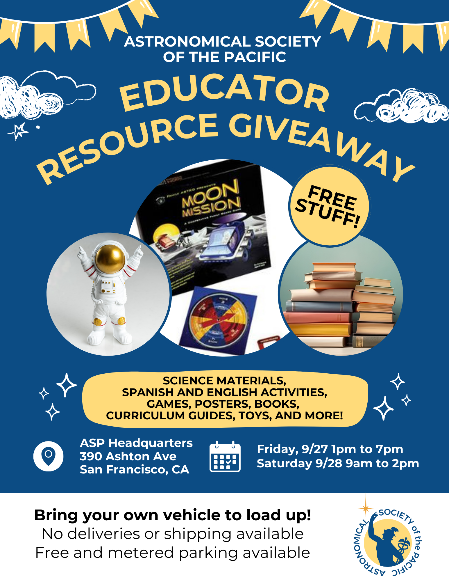 The ASP is opening its doors (390 Ashton Avenue, San Francisco, CA) on Friday, Sept 27th (1pm PT - 7pm PT) and 28th (9am PT - 2pm PT) to Bay Area educators looking for FREE materials for their classrooms or other educational settings.
